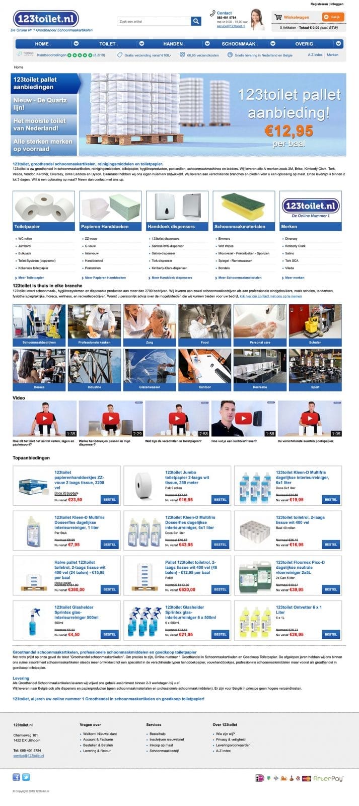 Het hoofdmenu mag wel wat meer aandacht krijgen. Er zitten nu verwarrende streepjes tussen en oranje stippen. We trekken het hoofdmenu 100% breed door en maken het een strakke donkerblauw. Het is duidelijk welke items uit gaan klappen. Het hoofdmenu telt maar een paar items, de rest blijft onder het uitklapmenu staan. Hierdoor kan ik het mooie cijfer 8,2 van de revieuws kwijt in de blauwe balk. Reviews spelen een steeds grotere rol in de markt van de online sales. De groene kleur accentueert het positieve gevoel van het mooie cijfer. De usp (unique selling points) van 123toilet krijgen een plek direct onder het hoofdmenu. Gratis verzending wordt tegenwoordig bijna normaal geacht door de consument, maar bij bedrijven onderling geldt vaak een minimale bestelwaarde.