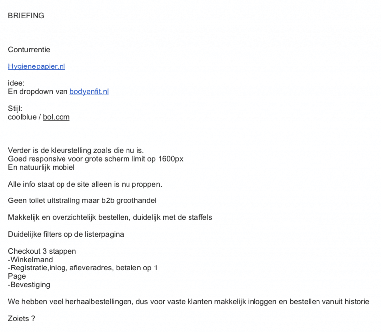 Nadat we het één en ander hebben geleerd van het DNA van 123toilet.nl, weten waar de krachten liggen, weten wat belangrijk is in de markt en we concurrenten hebben vergeleken, mogen we starten. We hoeven geen ‘functioneel design’ te maken, want daar wil onze opdrachtgever immers niets aan veranderen.